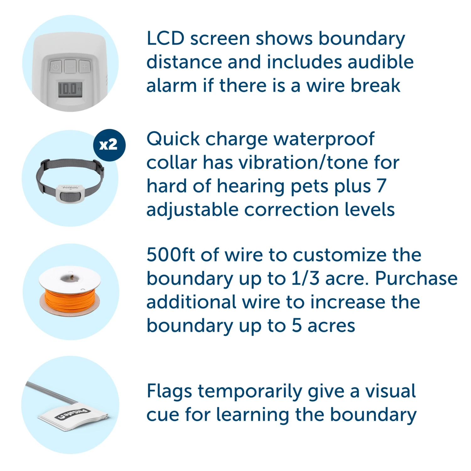 The Classic In-Ground Fence™ 2 Dog system will give you peace of mind knowing your dog is safe and secure inside his yard. This In-Ground Fence™ system comes with 2 collars so both dogs in your family can safely play outside together. If you have a rectangular or unique-shaped yard, an in-ground fence might be a great option. Setting up an in-ground fence is a DIY project, so we like to tell pet parents to plan to install your new fence over a weekend. The in-ground fence transmitter has an LCD screen that shows you what the boundary distance is set to and the wire break warning indicator. This kit comes with 500 feet of boundary wire which lets you secure a 1/3-acre yard. If your yard is larger, just purchase more boundary wire to fence in up to a 5-acre yard. The rechargeable receiver collars have 7 levels of adjustable static correction that you can set based on your dog’s temperament. The collars also have a tone and vibration level, which is great for when you’re training your dog. The receiver collars are also compatible with all PetSafe® Pawz Away Pet Barriers (sold separately), so you can keep your dog safe outside and away from off-limit areas inside your home with the same collar. You can add as many pets to this in-ground fence system as you need. Just purchase additional compatible collars for every pet in your family. Your pet deserves the best. Trust PetSafe® to keep your pet healthy, safe and happy.