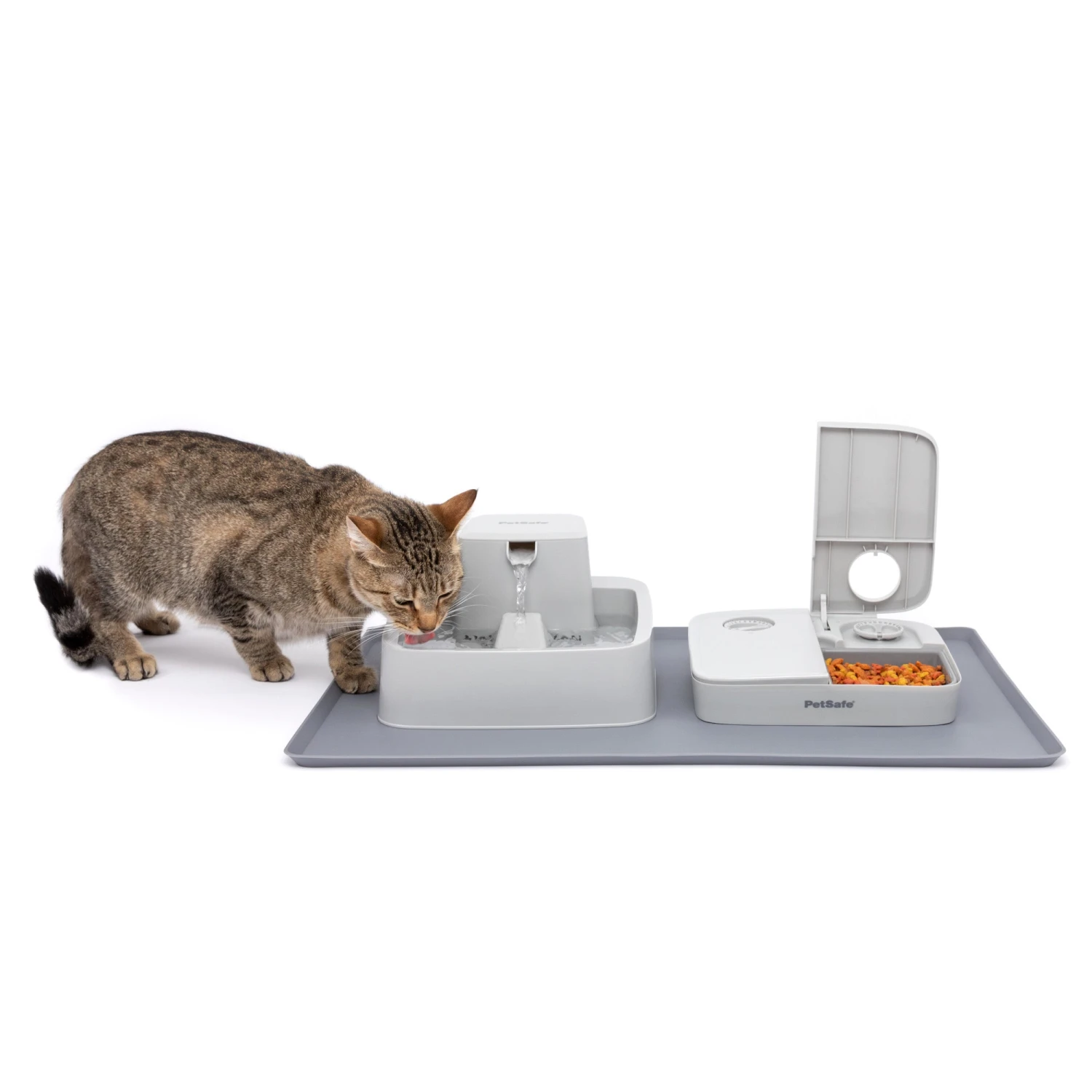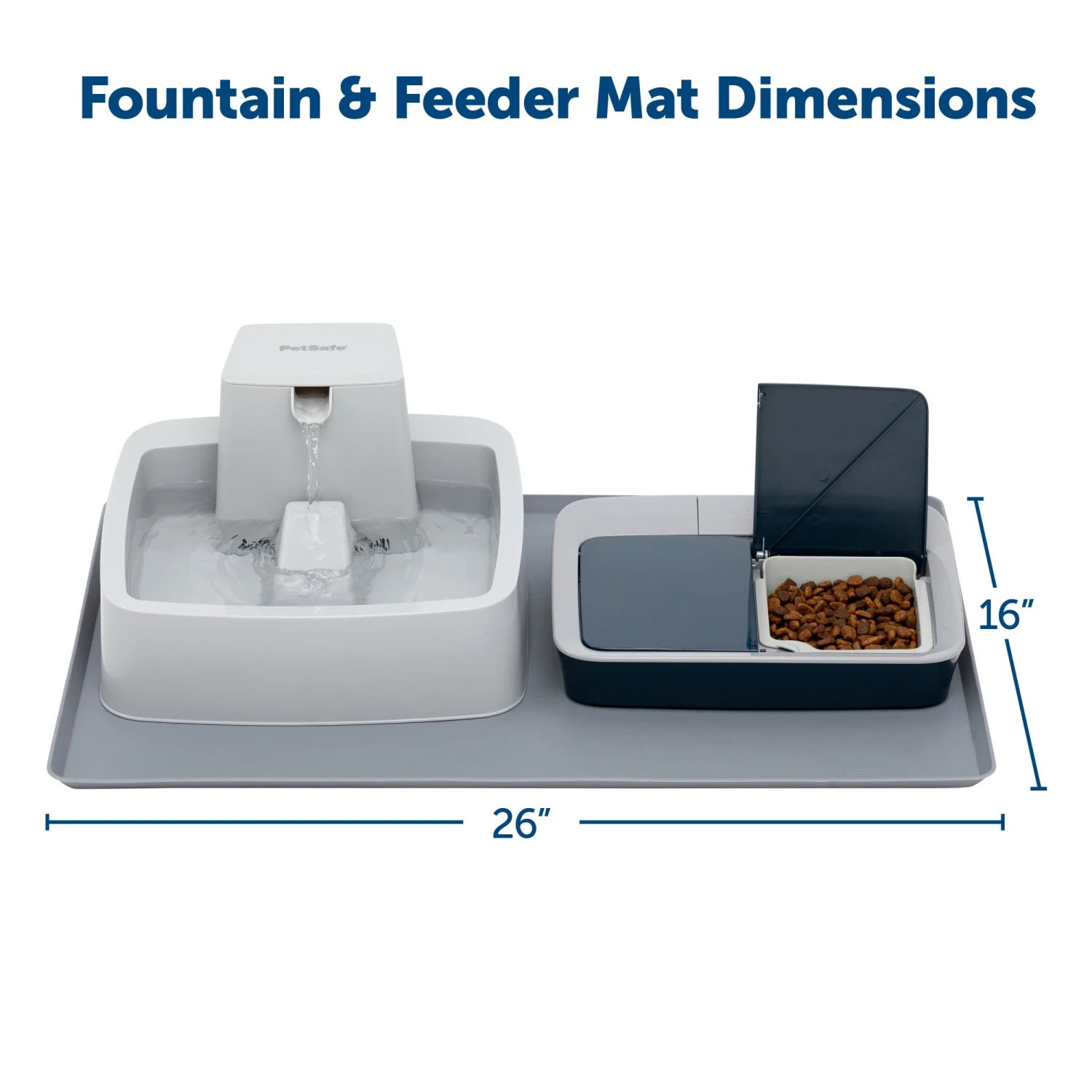 This oversized silicone cat and dog placemat measures 26 inches X 16 inches, and fits under PetSafe® pet fountains, pet feeders and standard-size food and water bowls. With the non-slip design, the placemat won’t slide around when your pet is eating or drinking.