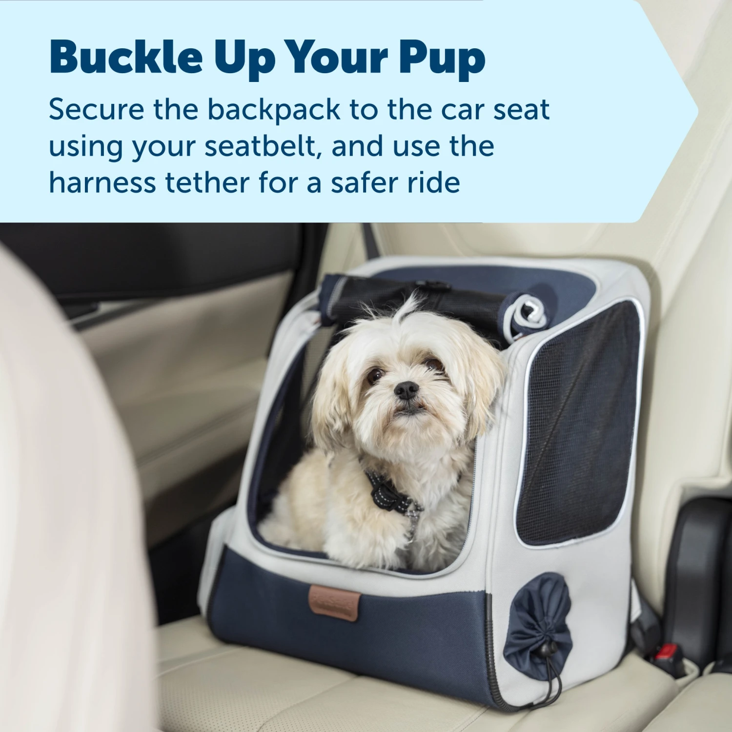 Cruise to your destination knowing your cat or dog is safe in the back seat by securing the pet carrier with a seat belt. The harness tether inside the pet backpack ensures your pet stays put, keeping their curious paws away from the seat belt buckle.