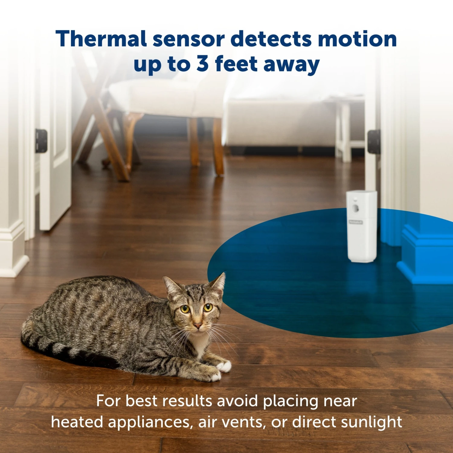 - Automatically senses pets up to 3 feet away and emits a quick, odorless spray